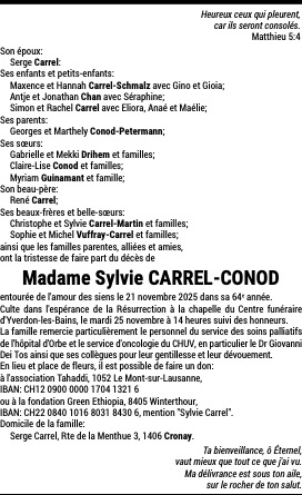 Suite au départ de notre cousine Sylvie Carrel Voici le faire part de décès